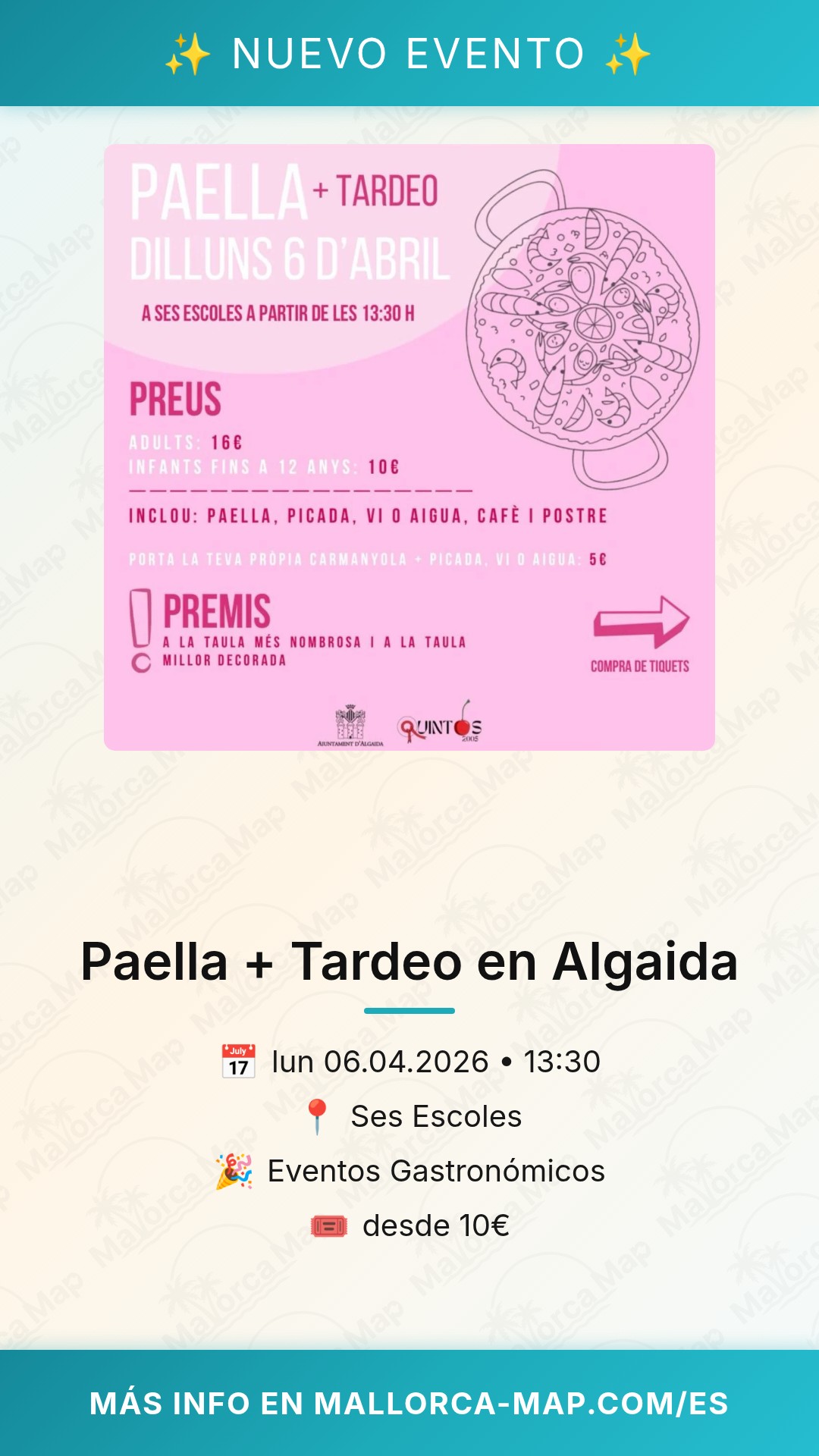 Ses Escoles es un lugar conocido por su hospitalidad y su capacidad para organizar eventos donde te sientes como en casa desde el primer minuto. Ya seas un residente que busca un plan diferente para el fin de semana o un visitante con ganas de conocer la Mallorca real más allá de las playas, este evento te ofrece lo mejor de ambos mundos: tradición culinaria y ocio moderno. No dejes pasar la oportunidad de vivir esta cita donde la paella es solo el comienzo de una tarde que promete ser memorable. ¡Reserva la fecha en tu calendario y prepárate para disfrutar del auténtico tardeo en Algaida!