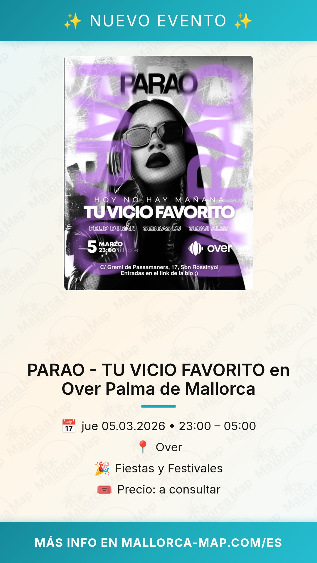 Ubicada en Son Rossinyol, a pocos minutos del centro de Palma, Over se ha consolidado como un referente para quienes buscan escapar de lo convencional y disfrutar de una producción de primer nivel. La noche del 5 de marzo, a partir de las 23:00, las puertas se abrirán para recibir a todos aquellos que saben que la vida se vive mejor bajo las luces de neón. No te quedes fuera de esta experiencia única. Asegura tu entrada a través del enlace oficial y prepárate para vivir una noche épica. Recuerda que el aforo es limitado y eventos como PARAO suelen colgar el cartel de "sold out" rápidamente. Ven con tus amigos, déjate llevar por el sonido de los mejores DJs y descubre por qué esta fiesta se llama tu vicio favorito. ¡Nos vemos en la pista de baile de Over!