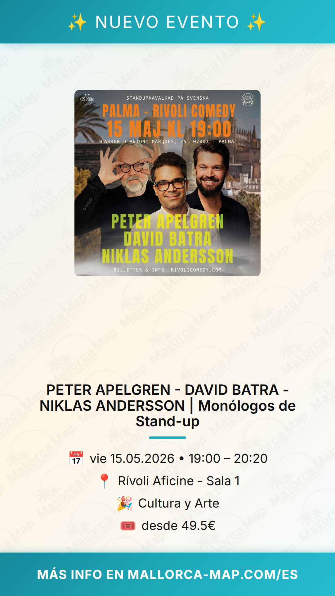 ¿Estás listo para una noche llena de risas y el mejor humor en el corazón de Mallorca? El próximo 15 de mayo de 2026, el emblemático Rívoli Aficine en Palma abre sus puertas para recibir a tres de los grandes nombres de la comedia: Peter Apelgren, David Batra y Niklas Andersson. Si buscas un plan diferente para terminar el día con una sonrisa, este espectáculo de stand-up comedy es exactamente lo que necesitas para desconectar de la rutina.
