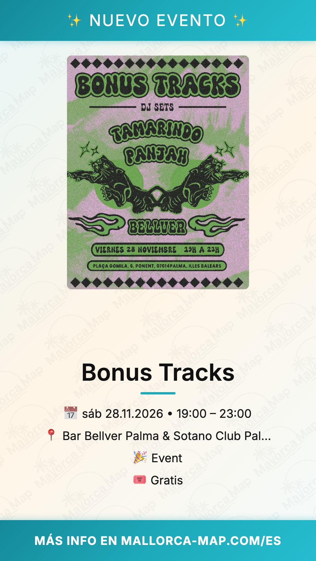 Llega temprano para pillar el mejor sitio, usa transporte público o taxi desde el centro de Palma. Con entrada libre, no hay excusas para perdértelo: ¡únete a la fiesta en Bonus Tracks y vive la noche mallorquina en su máxima expresión!