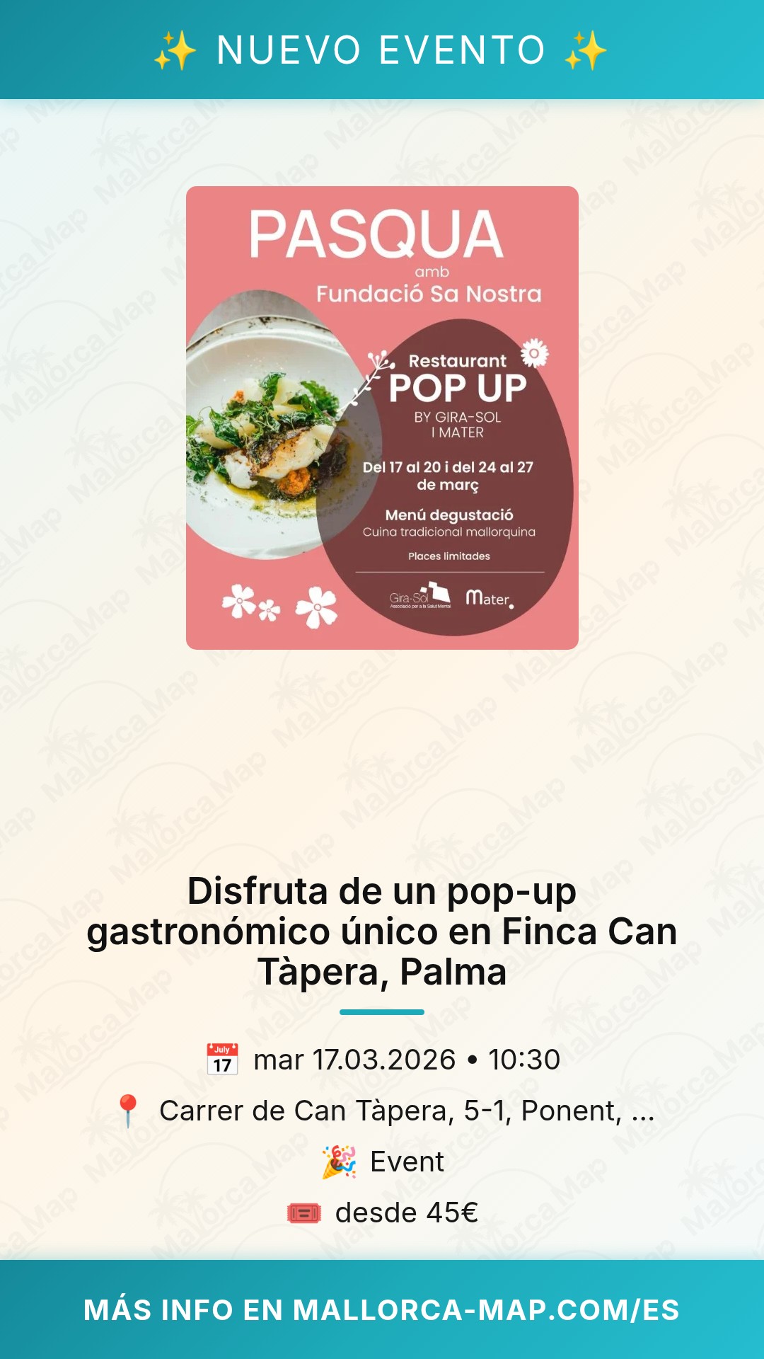 Si buscas una experiencia culinaria especial en Palma, no te puedes perder este evento exclusivo en la Finca Can Tàpera. Del 17 al 20 y del 24 al 27 de marzo, este entorno privilegiado se transforma en un restaurante pop-up único, organizado por Gira-Sol y Mater. Es la oportunidad perfecta para conectar con la esencia de Mallorca en un ambiente íntimo y acogedor.