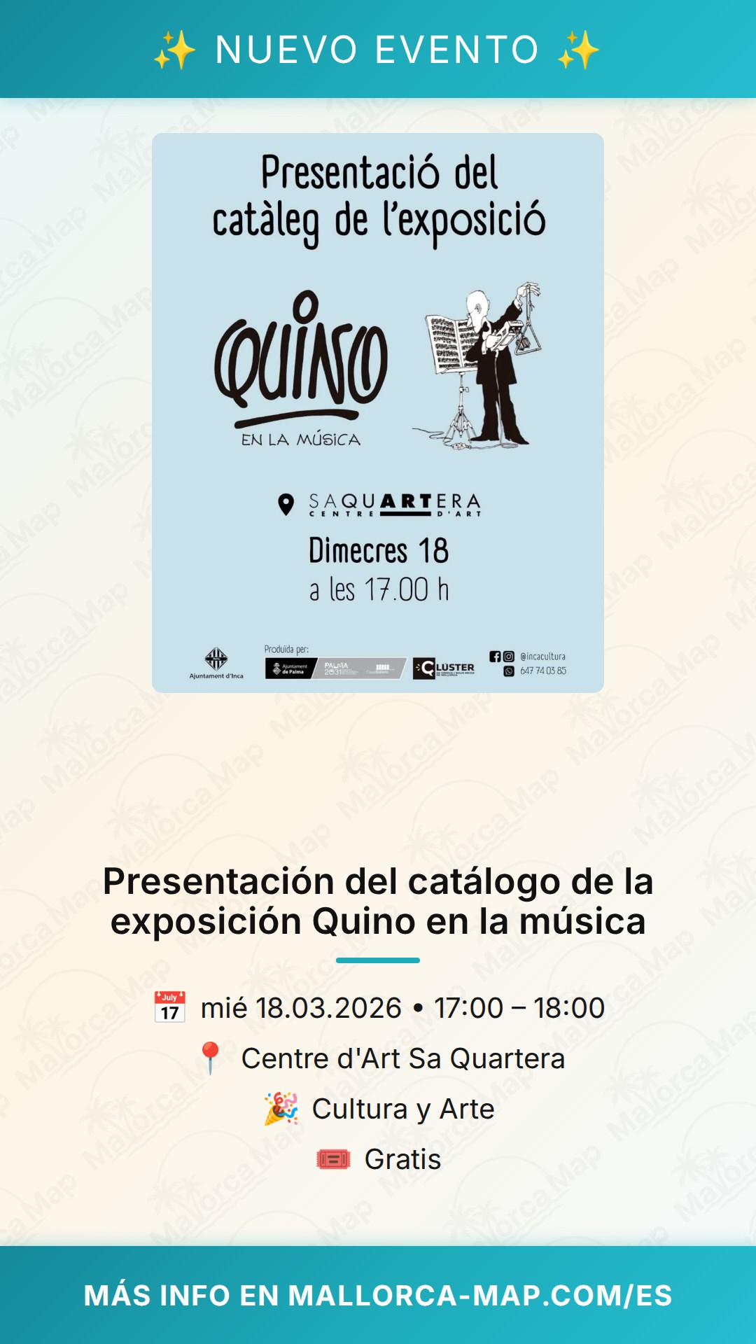 No olvides que la entrada es totalmente gratuita, lo que convierte a esta presentación en una excelente opción para disfrutar de la cultura de calidad sin coste alguno. Te recomendamos llegar con un poco de antelación al Centre d'Art Sa Quartera para asegurar tu lugar y, por qué no, aprovechar para pasear por las calles de Inca antes del inicio. ¡Ven a celebrar el legado de Quino y déjate inspirar por su visión única del mundo y la música!