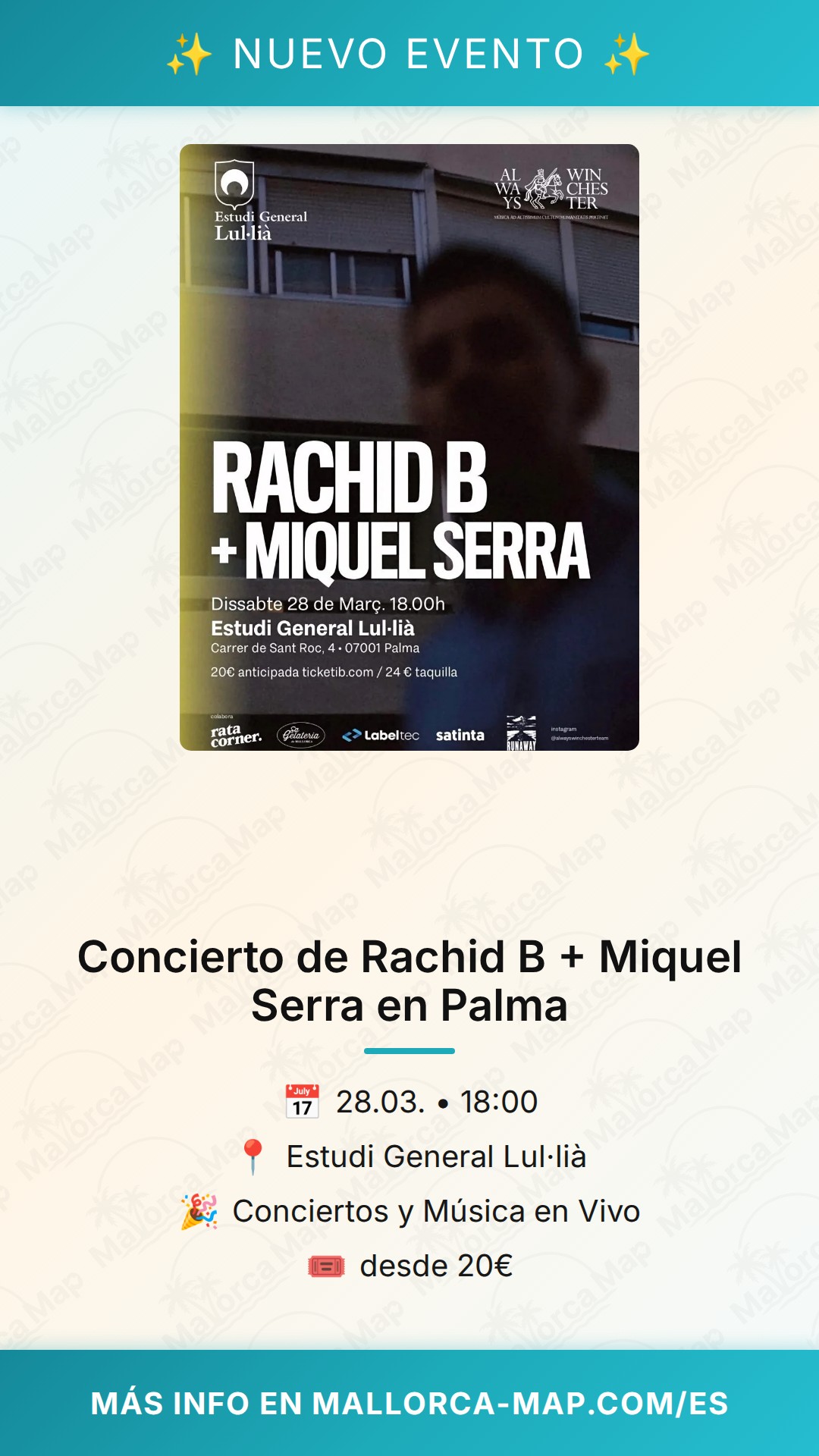 No dejes para el último momento la compra de tus entradas, ya que el aforo en este tipo de recintos suele ser limitado para preservar la cercanía entre el artista y el público. Ven con tus amigos o disfruta de la experiencia en solitario; lo importante es que no te pierdas la oportunidad de vivir la cultura de Palma en primera persona. ¡Te esperamos el 28 de marzo para compartir una tarde de música excepcional!