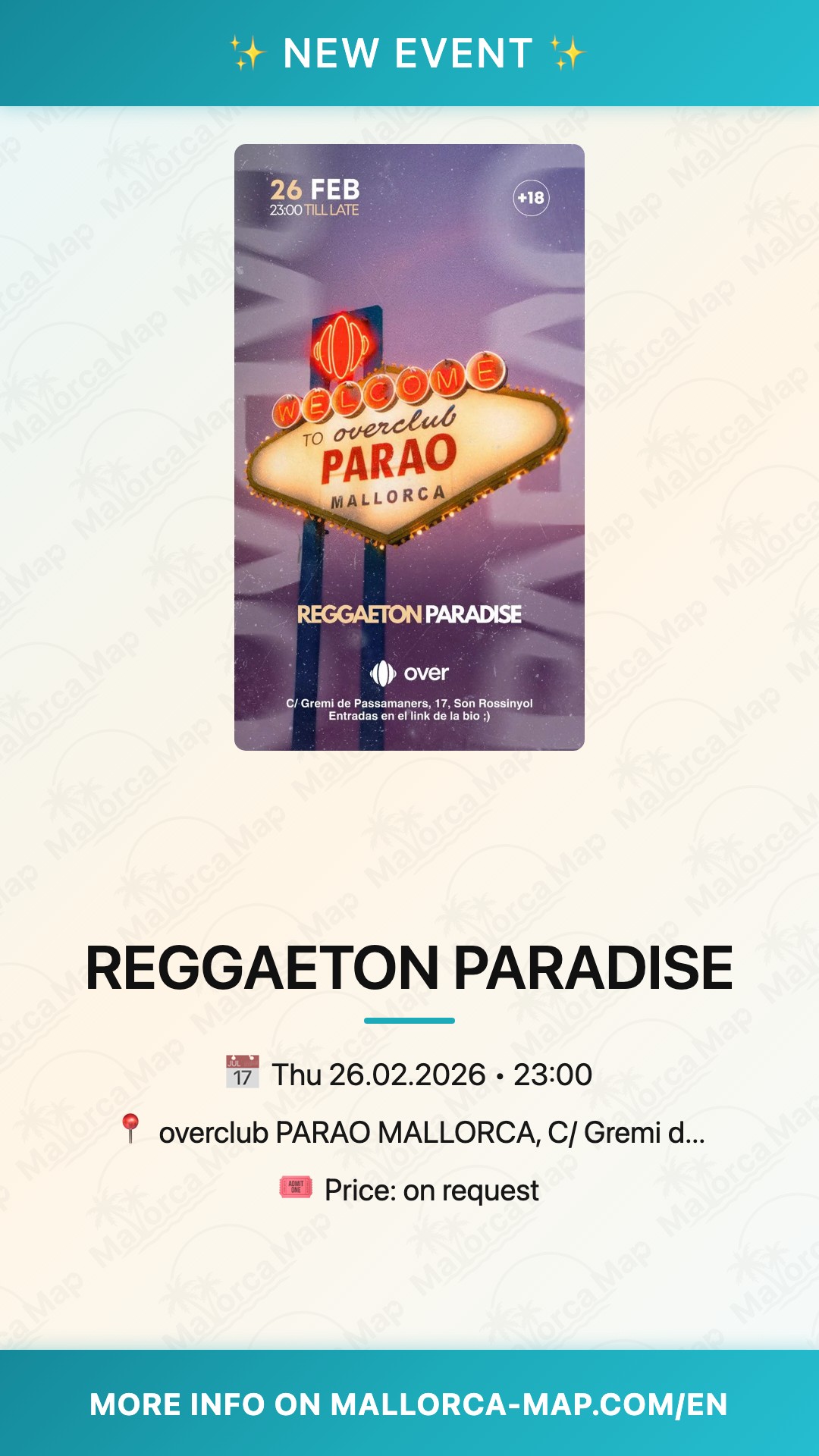 La fiesta comienza a las 23:00, por lo que te recomendamos llegar temprano para evitar esperas y aprovechar cada segundo de la sesión. Asegura tu acceso consultando la disponibilidad de entradas con antelación y prepárate para una noche de puro ritmo y desconexión. Ven con tu mejor outfit y déjate llevar por la magia de Reggaeton Paradise en Palma de Mallorca. ¡No dejes que te lo cuenten y ven a disfrutar de la fiesta más esperada de la temporada!