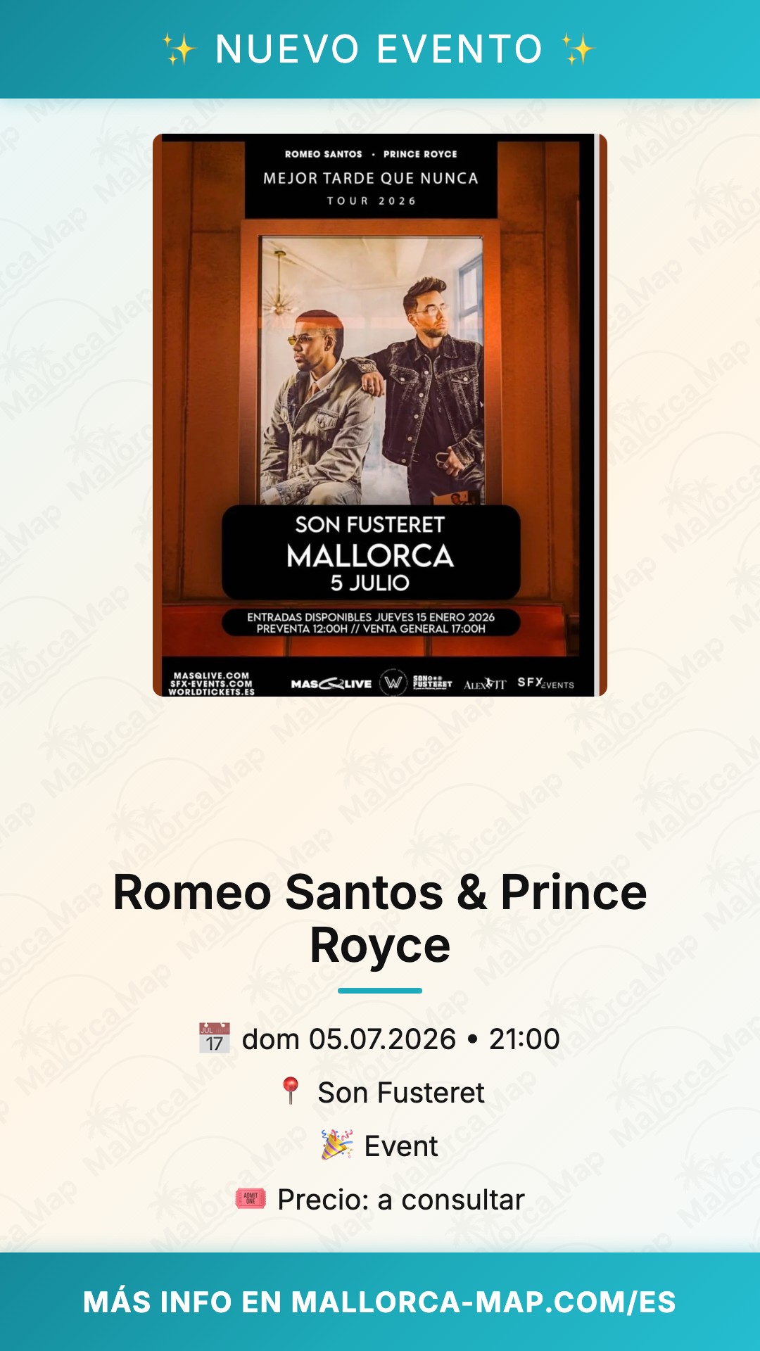 Vives una noche mágica en Palma con el regreso de los grandes de la bachata. El próximo 5 de julio de 2026, el recinto de Son Fusteret se convierte en el epicentro de la música latina con el esperado concierto de Romeo Santos & Prince Royce. Como parte de su gira Better Late Than Never Tour, estos iconos internacionales prometen transformar la noche mallorquina en un espectáculo inolvidable lleno de ritmo, pasión y melancolía bajo el cielo estrellado de las Baleares.