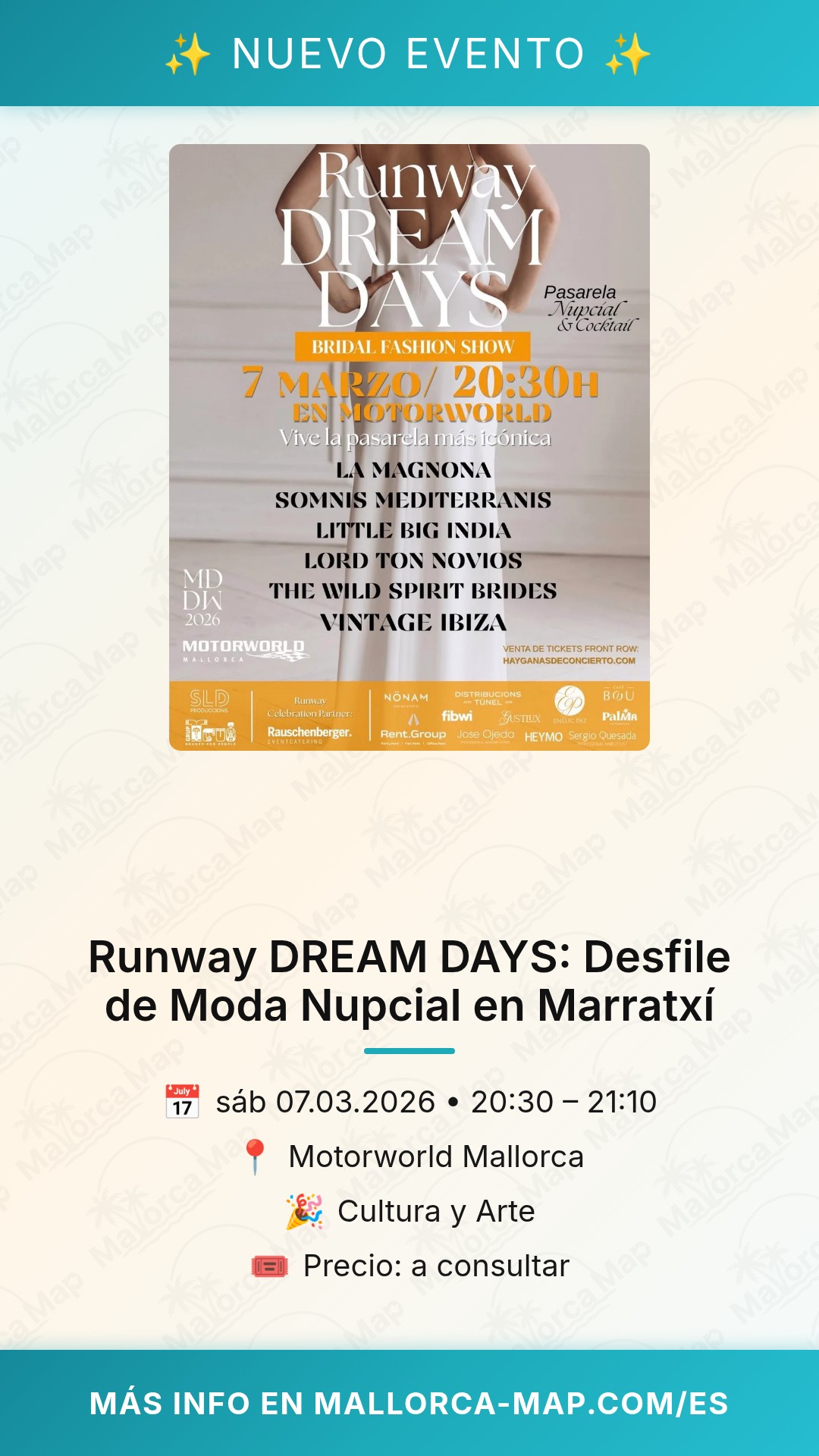 No dejes pasar la oportunidad de vivir esta experiencia sensorial en directo. La fusión entre el carácter industrial de Motorworld y la delicadeza de los tejidos de alta gama crea un escenario visualmente impactante. Asegúrate de reservar esta fecha en tu agenda y ven a descubrir por qué Runway DREAM DAYS se ha consolidado como el evento de moda nupcial más esperado de todo el año. ¡Te esperamos en Marratxí para compartir una noche donde los sueños se visten de gala!