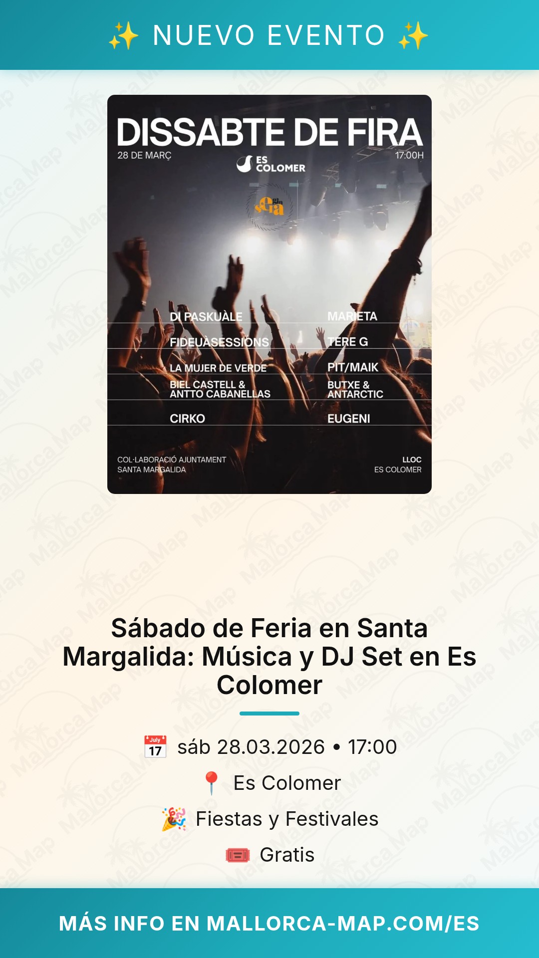 Recuerda marcar la fecha en tu calendario: 28 de marzo. Acércate a Es Colomer en Santa Margalida a las 17:00 y déjate sorprender por la magia del Sábado de Feria. ¡Trae tus ganas de pasarlo bien y disfruta de la mejor música en un entorno inmejorable! Nos vemos allí para celebrar juntos una de las tradiciones más vivas de nuestra querida Mallorca.