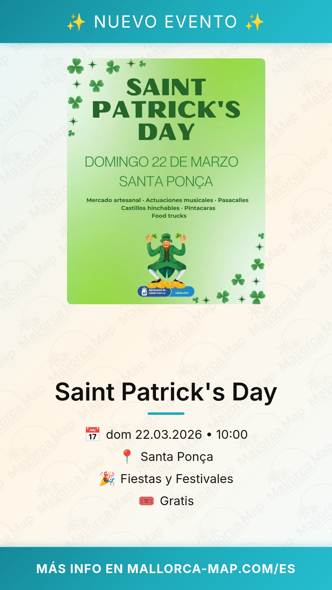 Este evento en Mallorca se llama "Saint Patrick's Day" y se celebra en Santa Ponça, Calvià, Mallorca. Fecha prevista: 2026-03-22, hora de inicio: 10:00:00. Información de precio: entrada gratuita. Este texto es un fallback seguro que se usa cuando una respuesta localizada del LLM no llega en formato válido de manera temporal. Aun así, los datos principales del evento quedan guardados y visibles para SEO, listados y páginas de detalle. Cuando haya una generación completa en los tres idiomas, el contenido se puede actualizar sin perder metadatos, slugs ni contexto de categoría. Así mantenemos estabilidad de importación, coherencia multilingüe y una experiencia fiable para los usuarios en todo momento.
