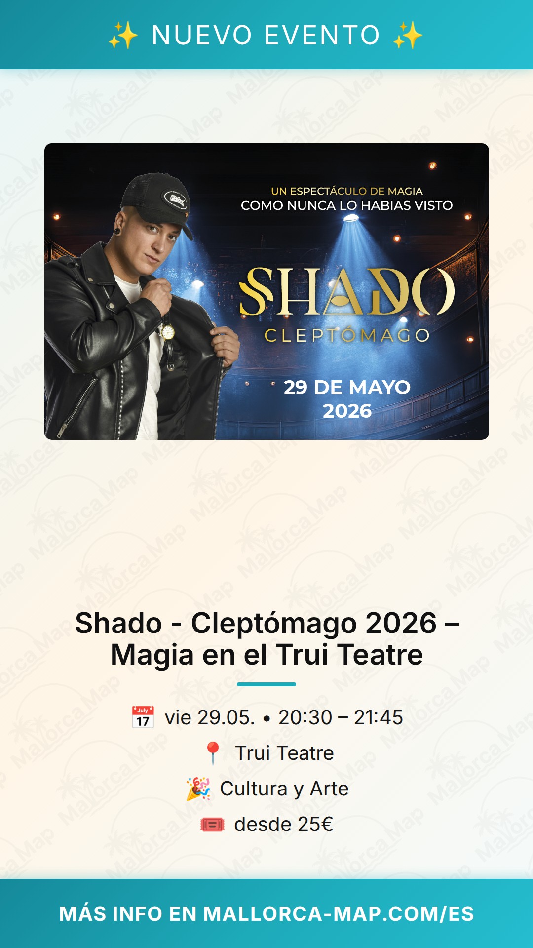 Vives una noche de asombro absoluto con el regreso de Shado a Mallorca. El próximo 29 de mayo de 2026, el Trui Teatre en el Camí Son Rapinya se convertirá en el epicentro del ilusionismo más transgresor con su nuevo espectáculo: Cleptómago. Tras un año de éxitos rotundos y llenos totales en su gira anterior, este artista que cautivó a audiencias masivas en programas como Got Talent, aterriza en Palma para desafiar todo lo que creías saber sobre la realidad y los límites de lo posible.