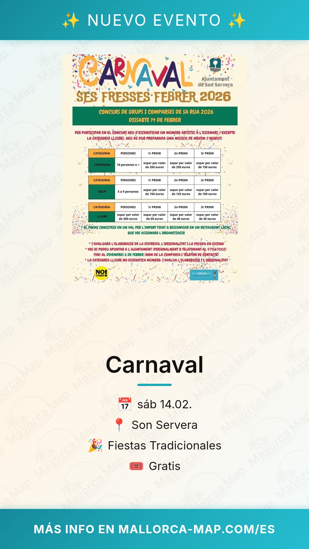 Al tratarse de un evento con entrada gratuita, te recomendamos llegar con antelación para encontrar un buen lugar a lo largo del recorrido del desfile en Son Servera, 07550 Mallorca. El municipio cuenta con zonas de aparcamiento en las inmediaciones del centro, facilitando el acceso a quienes se desplazan desde otros puntos de la isla. No pierdas la oportunidad de formar parte de esta tradición inolvidable y dejarte llevar por la magia de Sa Rua en una de las zonas más auténticas de Mallorca.