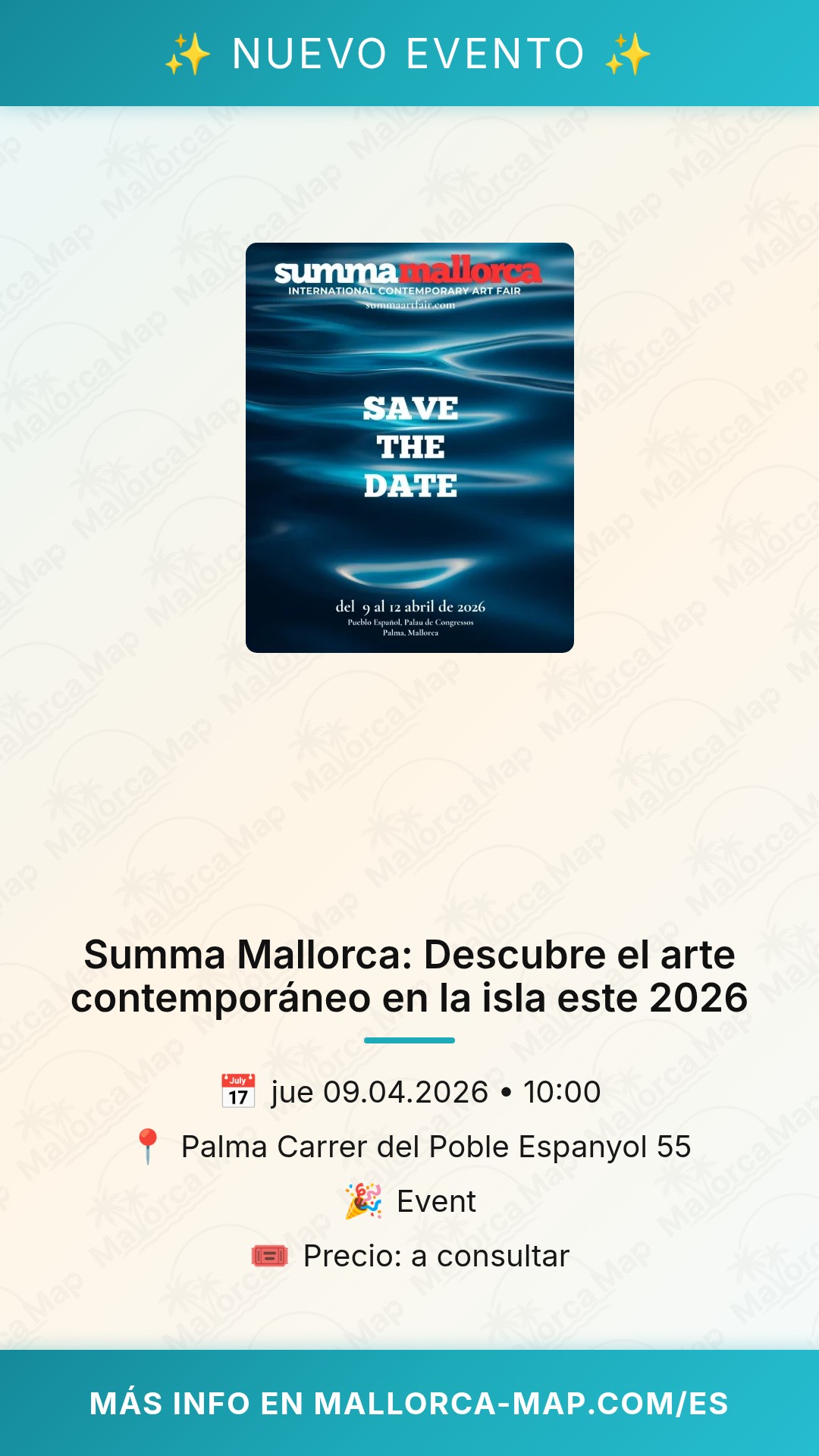 Si eres un amante del arte contemporáneo y buscas una experiencia cultural única en Mallorca, marca en tu calendario el próximo 9 de abril de 2026. La feria de arte "Summa Mallorca" abre sus puertas para ofrecerte un encuentro ineludible con la creatividad, la vanguardia y el talento artístico más destacado del panorama actual. Es la oportunidad perfecta para sumergirte en un ambiente vibrante, diseñado específicamente para conectar a coleccionistas, entusiastas y curiosos en un entorno mediterráneo inigualable.
