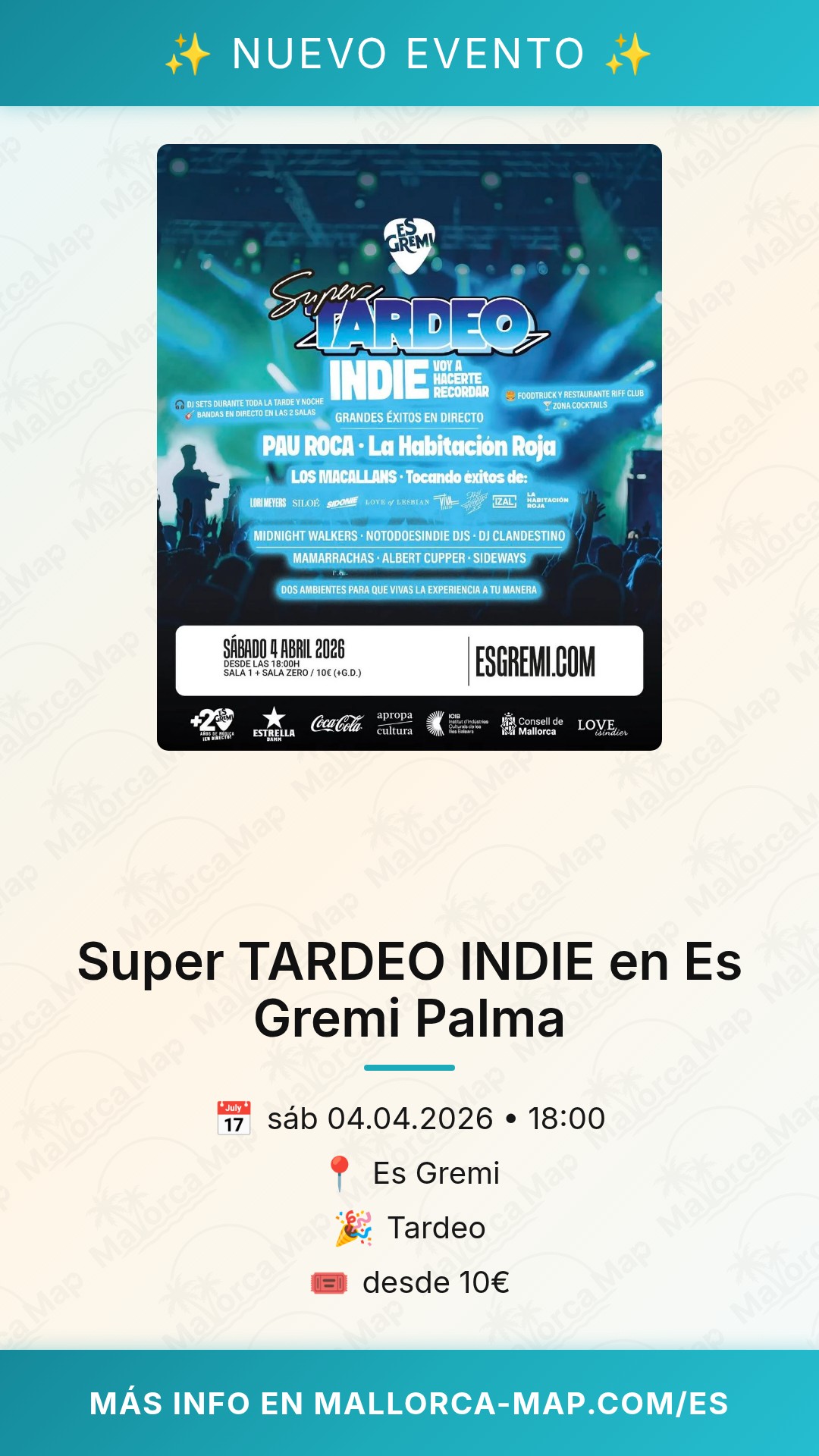 ¿Estás listo para vivir una de las tardes más intensas y vibrantes en Palma? El próximo 4 de abril de 2026, Es Gremi se transforma para acoger el Super TARDEO INDIE, una cita imprescindible si eres amante de las guitarras, las letras con sentimiento y el mejor ambiente de la isla. Desde las 18:00, prepárate para un viaje sonoro que te hará recordar por qué el indie es mucho más que música; es una forma de sentir.