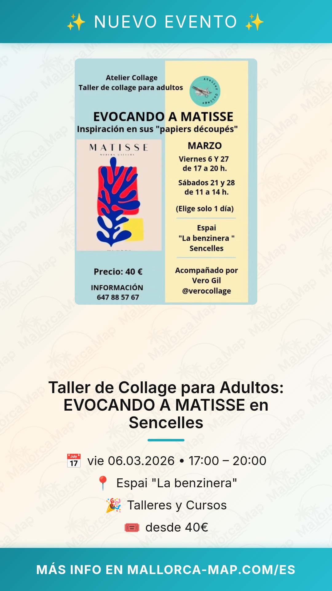 Participar en un taller como este en el centro de la isla es también una excelente excusa para visitar Sencelles. Puedes aprovechar el día para pasear por sus calles tranquilas antes de sumergirte en la creación artística. Recuerda que este evento no es gratuito y requiere inscripción previa, lo que garantiza un grupo reducido y una atención más personalizada para que puedas desarrollar tu proyecto a tu propio ritmo. No pierdas la oportunidad de llevarte a casa tu propia obra inspirada en el legado de Matisse. Marca el 6 de marzo de 2026 en tu calendario y prepárate para una jornada de recortes, colores intensos y mucha imaginación. ¡Te esperamos en Sencelles para dar vida a tus ideas!