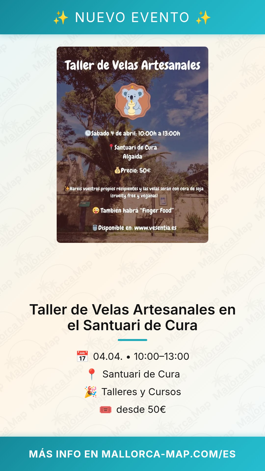 ¿Buscas una experiencia creativa y relajante en uno de los lugares más emblemáticos de Mallorca? El próximo 4 de abril tienes una cita muy especial en el Santuari de Cura, en Algaida. Te invitamos a participar en nuestro Taller de Velas Artesanales, una oportunidad única para desconectar del ruido diario y conectar con tu lado más artístico mientras disfrutas de las impresionantes vistas que ofrece la cima del Puig de Randa.