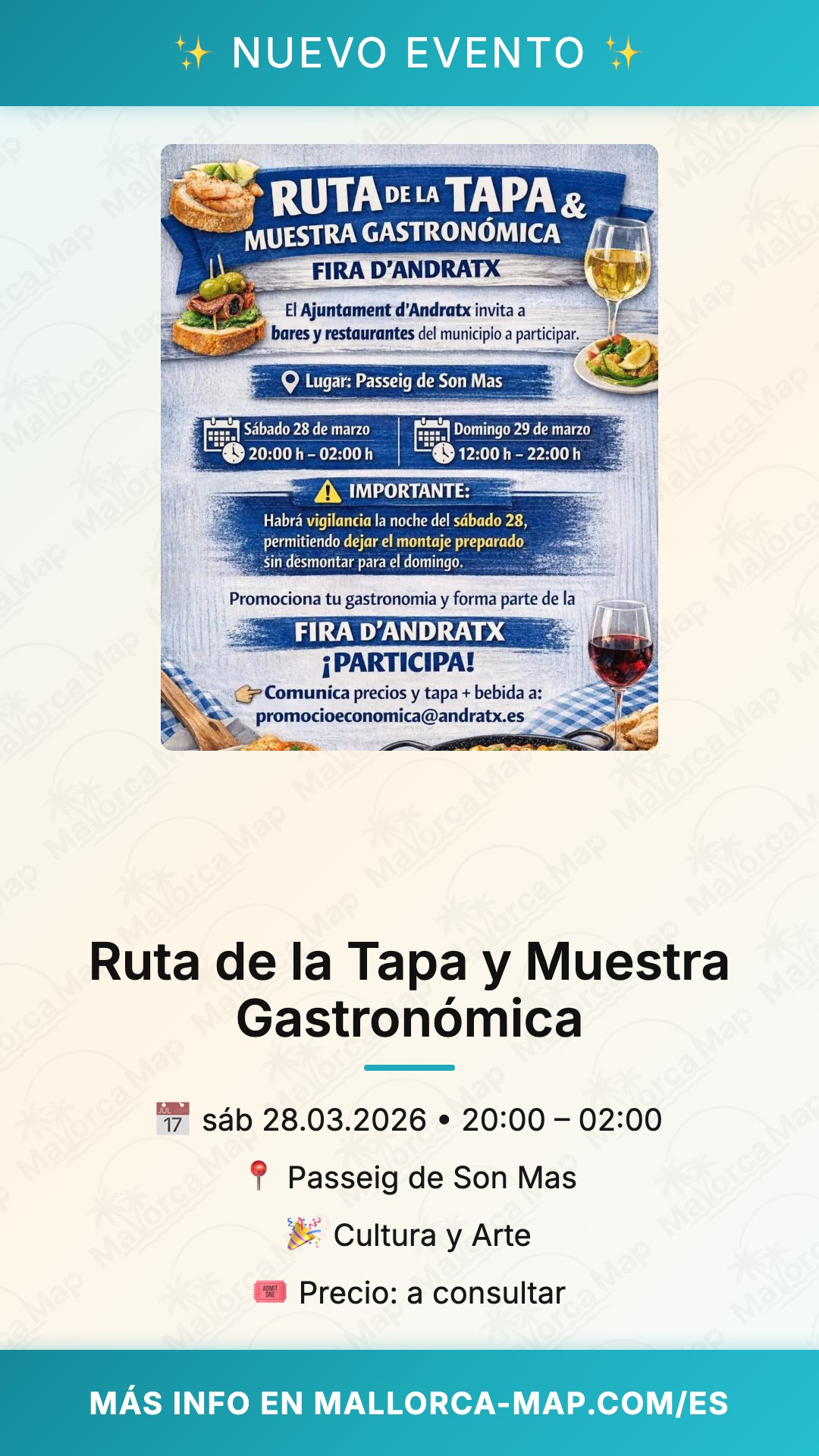 Este evento es el plan ideal para los amantes del buen comer, familias que buscan un día diferente y grupos de amigos que desean disfrutar del ambiente social de la isla. La atmósfera en el Passeig de Son Mas es relajada pero efervescente, con el suave murmullo de las charlas y la música de fondo que acompaña la brisa de la tarde. Es el lugar donde la cultura se encuentra con el paladar, ofreciendo una visión auténtica de la vida en Andratx, lejos del bullicio turístico convencional y enfocada en el placer de compartir.