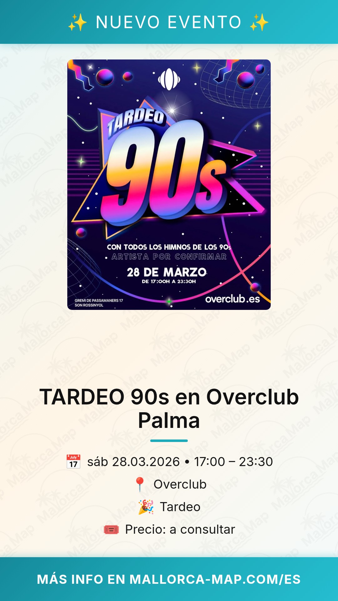 No dejes que te lo cuenten. Si eres de los que todavía se emociona cuando escucha los primeros acordes de un hit de los 90, este evento está hecho para ti. Asegúrate de llegar temprano para aprovechar cada minuto de esta experiencia temática única en Mallorca. Recuerda que la cita comienza a las 17:00. ¡Ven con ganas de bailar y disfrutar del auténtico espíritu de los 90 en pleno corazón de Palma!