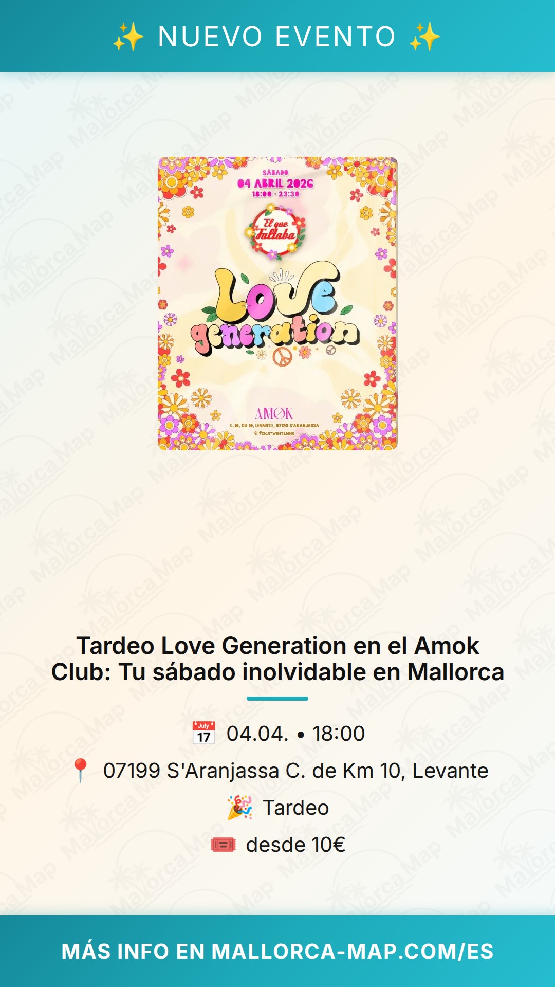 No dejes que te lo cuenten. Los sábados en Mallorca tienen una nueva identidad gracias a Love Generation. Te recomendamos llegar con tiempo para asegurar tu lugar en la pista y disfrutar de cada momento de esta experiencia única. La cita es el 4 de abril de 2026, un día marcado en el calendario para todos los amantes de la buena música y el ambiente social. Prepara a tu grupo, organiza tu tarde y prepárate para vivir una experiencia inolvidable en el corazón de Mallorca. ¡Nos vemos en el Amok Club para disfrutar del mejor tardeo!