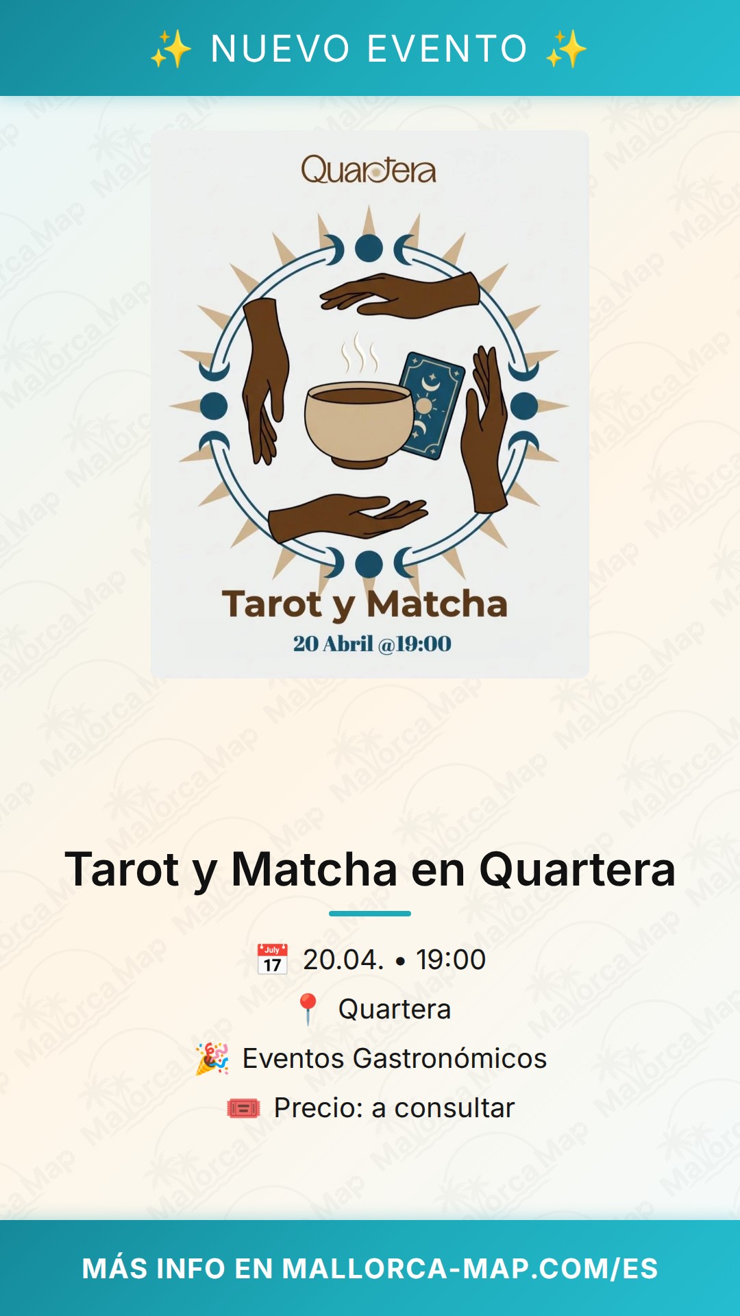 El evento comienza puntualmente a las 19:00, la hora ideal para disfrutar de un tardeo diferente antes de que termine el día. Te recomendamos reservar tu plaza con antelación y llegar unos minutos antes para acomodarte y sumergirte en la energía del lugar desde el primer momento. No dejes pasar esta oportunidad de vivir Mallorca desde una perspectiva mucho más consciente, pausada y espiritual. ¡Ven a Quartera y deja que el tarot y el matcha te guíen en una tarde que promete ser inolvidable!