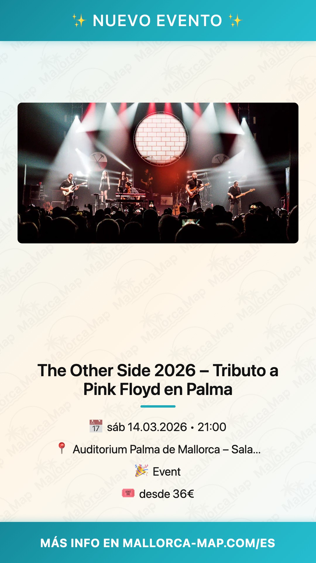 Vives una noche inolvidable en el corazón de la bahía de Palma el próximo sábado 14 de marzo de 2026. El Auditorium de Palma abre sus puertas para recibir a The Other Side, considerada la banda tributo a Pink Floyd más longeva y respetada de España. A partir de las 21:00 horas, la Sala Magna se transformará en un epicentro de psicodelia y rock progresivo, ofreciendo una Live Experience que va mucho más allá de un simple concierto. Es una oportunidad única para conectar con el legado de los gigantes británicos en un entorno acústico privilegiado frente al Paseo Marítimo de Mallorca.
