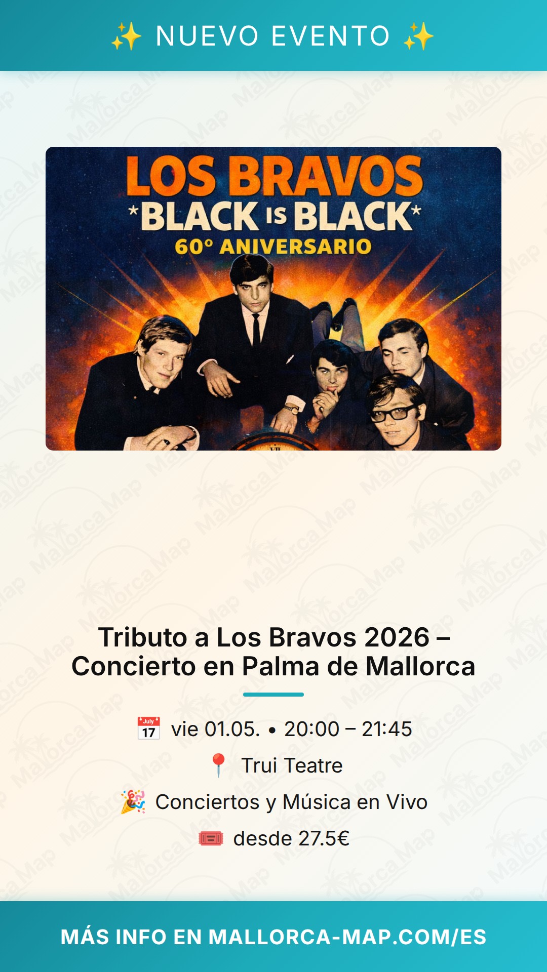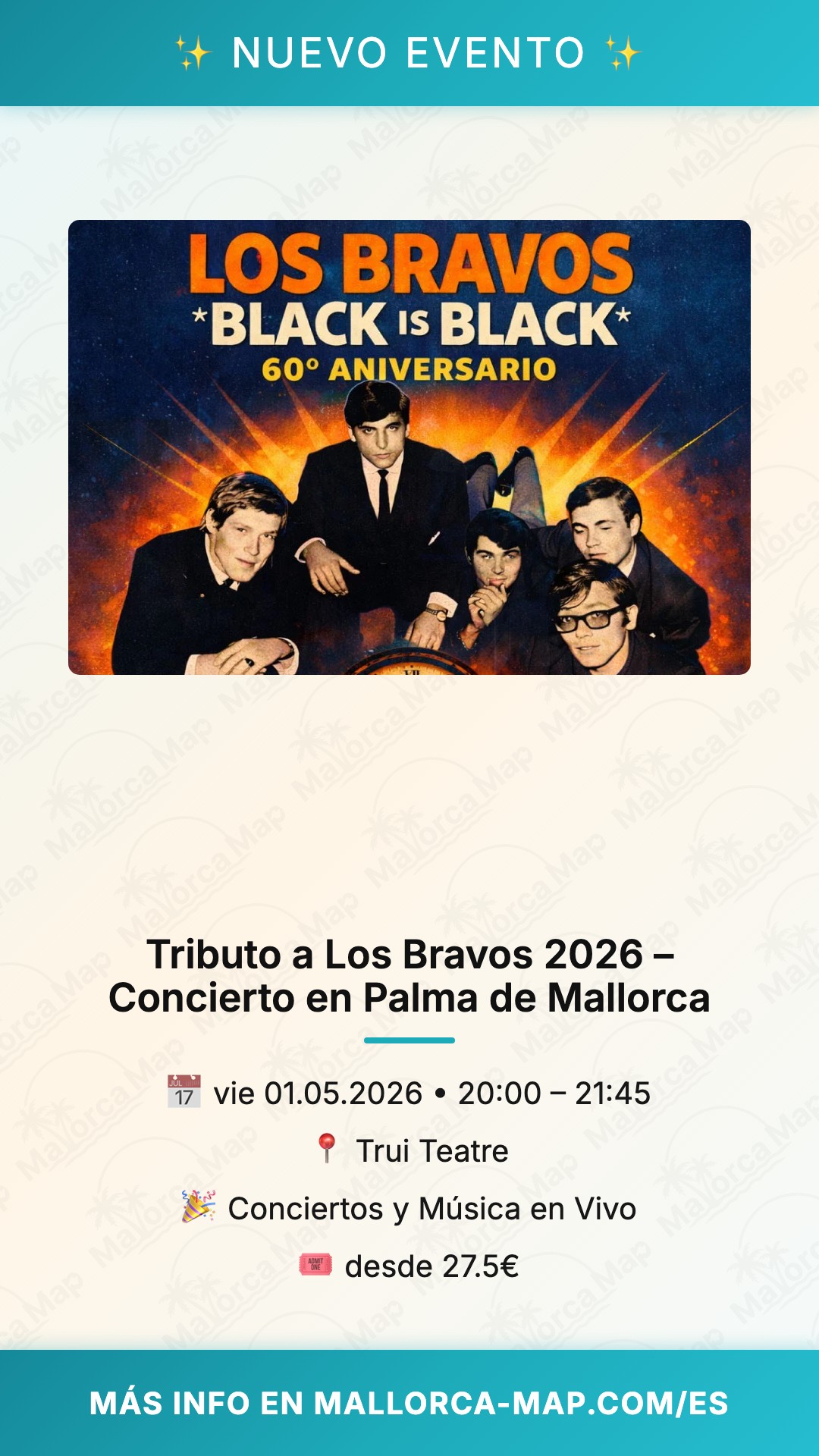 Vives una noche donde la historia de la música española recobra todo su esplendor en el Trui Teatre de Palma. El próximo 1 de mayo de 2026, te espera el Tributo a Los Bravos – Black is Black, un evento que conmemora el 60.º aniversario del hit que rompió fronteras y situó a España en el mapa del pop internacional. Este no es un simple concierto, sino un reencuentro emocional con una época dorada en el corazón de Palma de Mallorca, donde el sonido beat más auténtico volverá a vibrar con una fuerza renovada.
