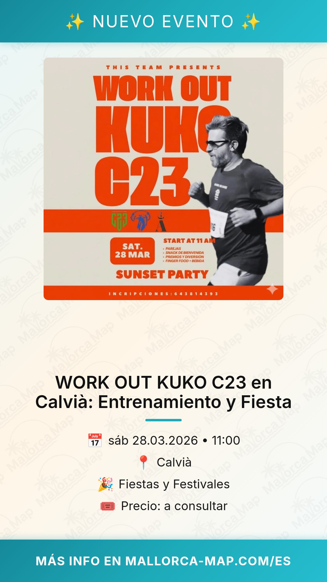 ¿Estás listo para sudar y divertirte al máximo en Calvià? El evento WORK OUT KUKO C23 llega para ofrecerte una experiencia única que combina el desafío físico con el mejor ambiente social de la isla. Si buscas un plan diferente para este 28 de marzo, prepárate para una jornada donde el deporte y la celebración se dan la mano en un entorno inmejorable.
