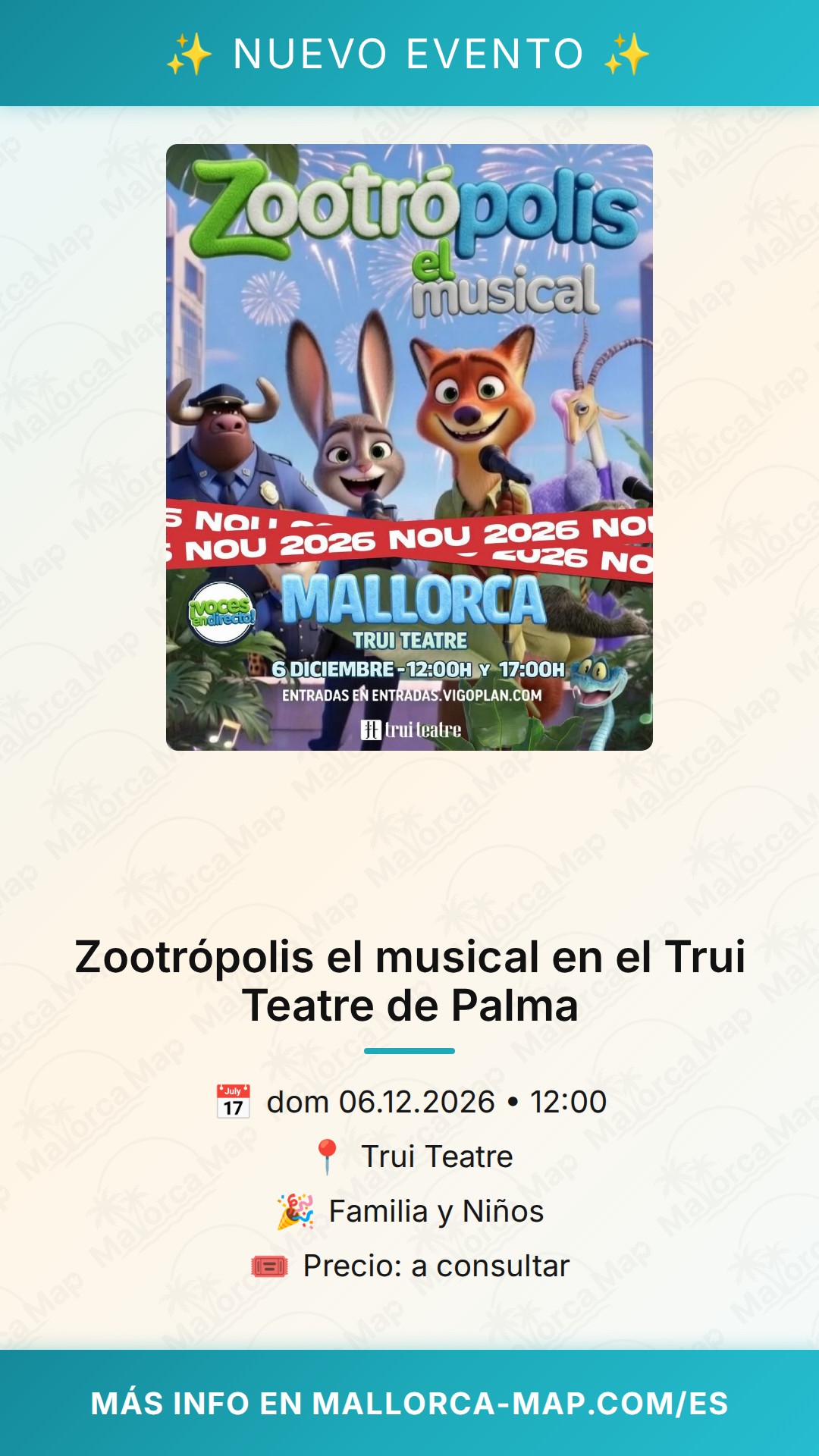 No dejes para el último momento la planificación de tu domingo. Este tipo de espectáculos suelen agotar sus localidades rápidamente debido a la gran demanda de ocio infantil de calidad en la isla. Prepárate para una mañana de domingo diferente, llena de música, valores positivos y mucha diversión. Asegúrate de llegar con tiempo al teatro para encontrar tu sitio y sumergirte de lleno en la magia de este musical. ¡Tus hijos te lo agradecerán y tú disfrutarás viendo sus caras de ilusión mientras ven a sus héroes de la pantalla grande a pocos metros de distancia! Nos vemos en el Trui Teatre para celebrar juntos el talento y la alegría de Zootrópolis.