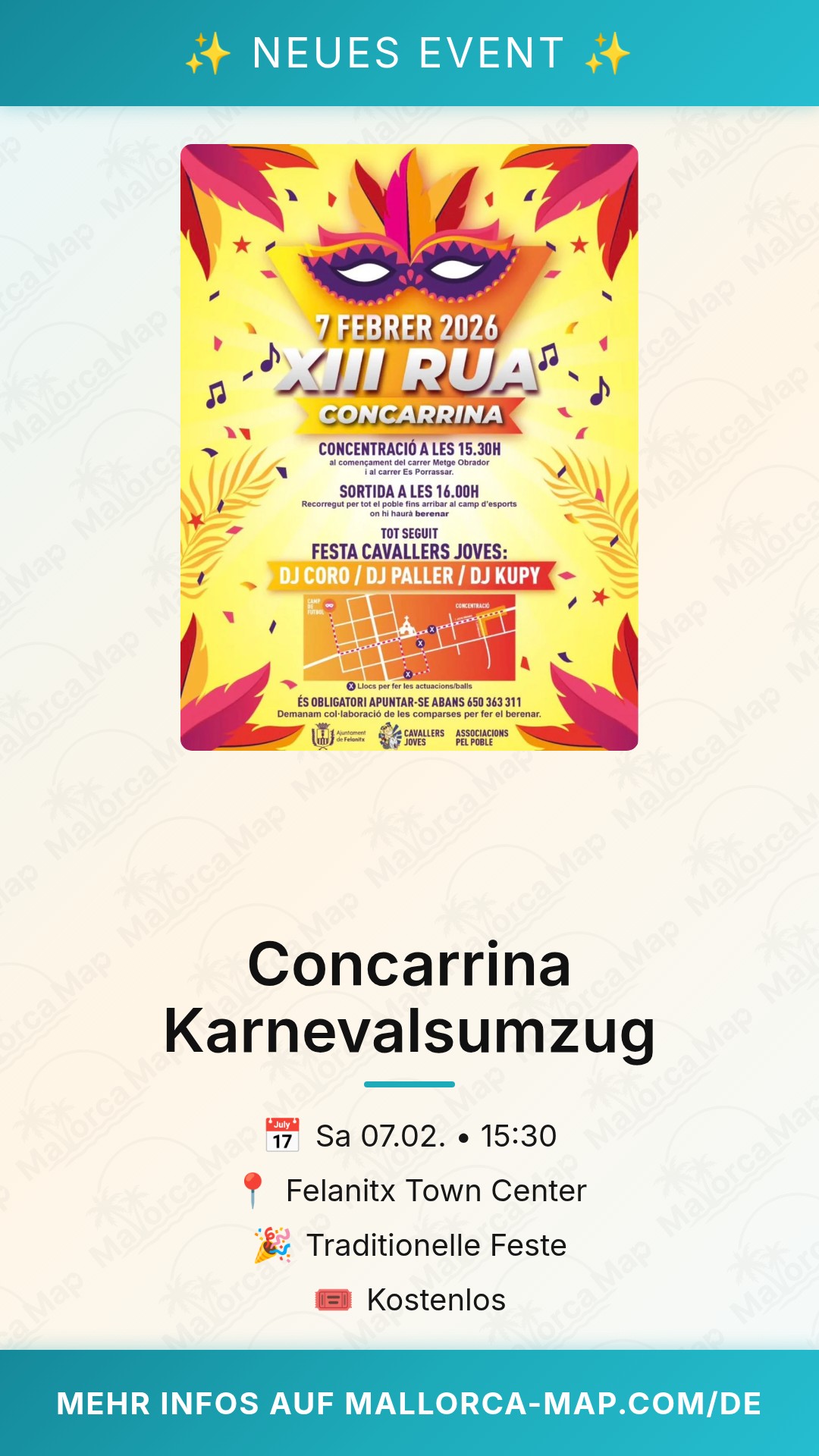 El Carnaval en Mallorca es colorido, familiar y diverso – desde el gran desfile de Palma hasta celebraciones pequeñas en pueblos. Usa los consejos de esta guía, consulta el mapa y revisa los eventos actuales abajo. Así encontrarás el plan de Carnaval Mallorca que mejor se adapta a ti, ya sea Sa Rua, Sa Rueta o un Carnaval local en un pueblo pequeño.